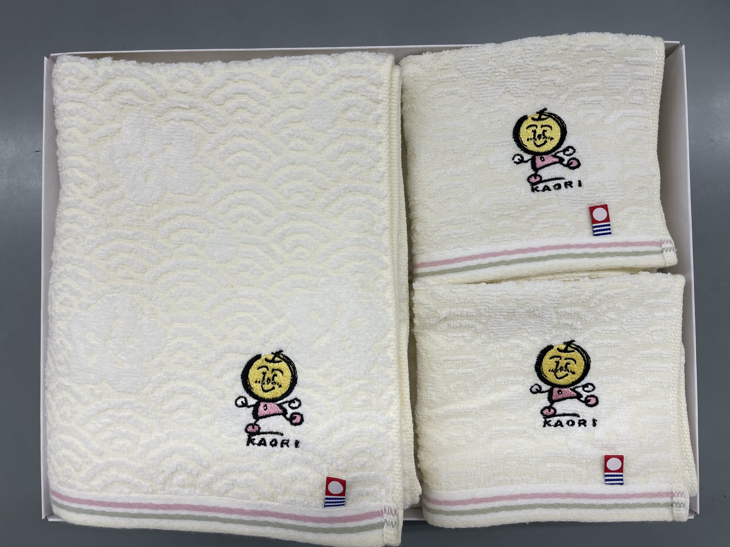 梨のまち・白井の人気キャラクター、なし坊の妹「かおり」が上品なワンポイント刺繍で施された上質なタオルギフトです。